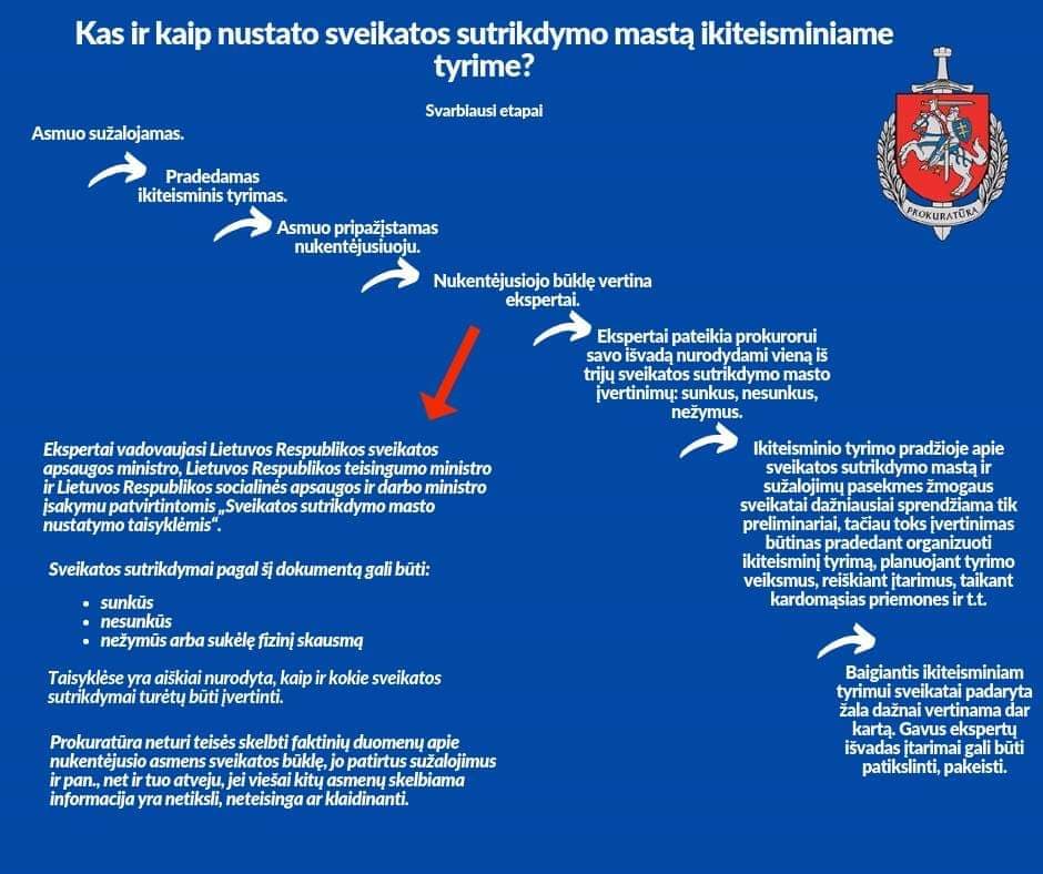 Užbėgdama galimai rimtesniems visuomenės neramumams Lietuvos Respublikos prokuratūra išplatino pranešimą,kuriame nuosekliai paaiškina,kas ir kaip nustatinėja sveikatos sutrikdymo mastą ikiteisminiame tyrime.