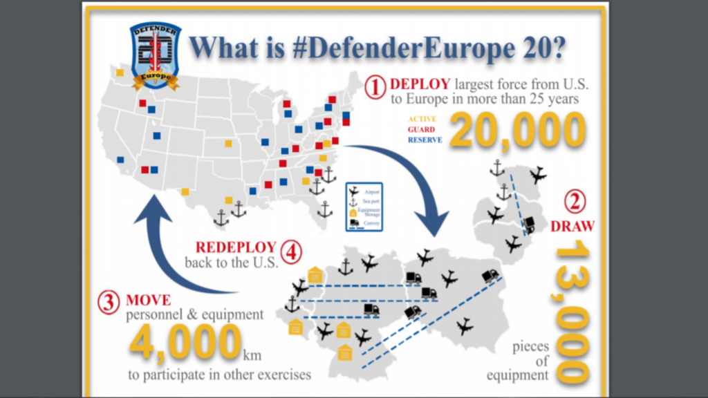 Šiais metais balandį ir gegužę buvo planuota surengti JAV vadovaujamas pratybas „Defender Europe 2020“( „Europos gynėjas 2020” ), į kurias iš Jungtinių Valstijų į Europą turėjo būti atsiųsta 20 tūkst. karių. Žmonės ir medžiagos į Europą būtų buvę atgabenami laivais ir orlaiviais į 14 -ka jūrų ir oro uostų vietų Nyderlanduose, Belgijoje, Prancūzijoje ir Vokietijoje, o geležinkelių ir kelių transportu toliau keliautų į Lenkiją ir Baltijos šalis. Pratybos turėjo vykti nuo 2020 m. Vasario iki gegužės. Maždaug 4000 km ilgio vilkstinės maršrutas Europoje. Šis JAV karių dislokavimas Europoje būtų buvęs didžiausias per daugiau kaip 25 pastaruosius metus. Manevrai turėjo vykti 10-yje Europos šalių, įskaitant Vokietiją, Lenkiją, Lietuvą, Latviją, Estiją ir Sakartvelą. Įvertinus COVID-19 ligos protrūkį visame pasaulyje JAV kariuomenės vadovybė pratybas sustabdė. Tačiau iki pandemijos paskelbimo sausio mėnesį JAV jau atsiuntė į Europą 6 tūkst. karių, taip pat pasiuntė į regioną 12 tūkst. technikos ir įrangos vienetų iš įvairių bazių Amerikoje.