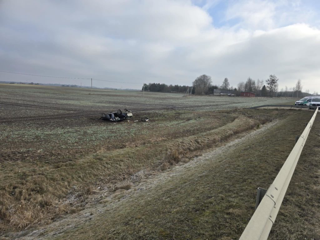 2025-02-12 apie 14.00 kelyje Kaunas-Jurbarkas įvyko eismo įvykis. Kol kas, dėl neaiškių aplinkybių šalia kelio laukuose atsidūrė lengvasis automobilis. Jis „nuskriejo” net apie 20 metrų nuo važiuojamosios dalies ir apvirto ant stogo. Įvykio vietą apžiūrinėjo pareigūnai, nukentėjusiųjų nesimatė.